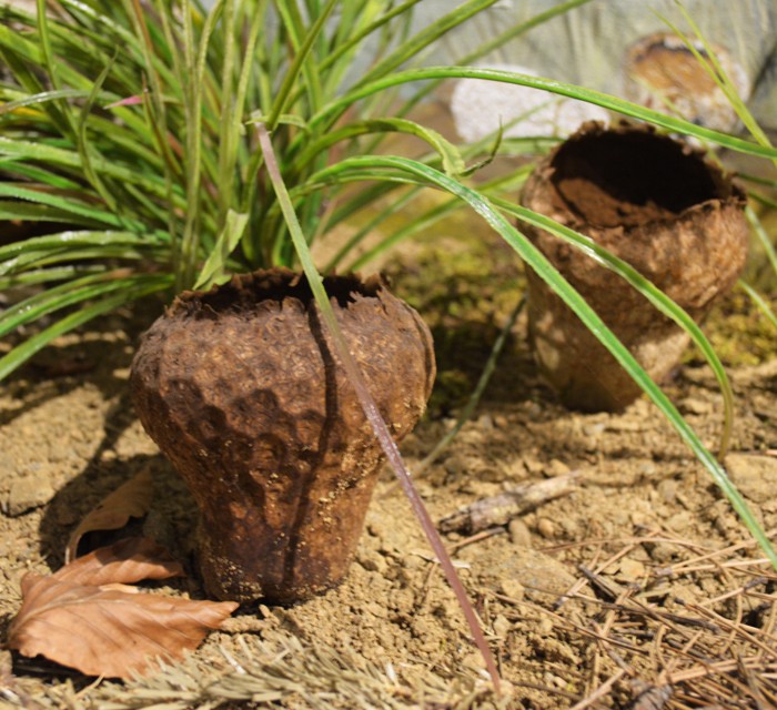Μορφολογία: Βασιδίωμα με ύψος 5-14 εκ. Και διάμετρο 5-18 εκ., αρχικά σφαιρικό, αχλαδόμορφο αργότερα με ρυτιδωμένη βάση, με λευκές, πυραμιδόμορφες προεξοχές που φτάνουν έως την κορυφή της βάσης. Σταδιακά οι προεξοχές εξαφανίζονται και τα υπολείμματα τους σχηματίζουν ένα δικτυωτό πλέγμα από ραγάδες πάνω στο εξωπηρίδιο, που μεταχρωματίζεται από κρεμ σε ωχροκίτρινο και τελικά σε καφετί. Στην ωριμότητα το εξωπηρίδιο εξαφανίζεται, αποκαλύπτοντας το γκριζοκαφετί ενδοπηρίδιο, που είναι λευκό σαν τσιγαρόχαρτο και περικλείει τον θρόμβο. Θρόμβος αρχικά λευκός και συμπαγής σαν μαλακό τυρί, κιτρινοπράσινος αργότερα. Στην ωριμότητα μετατρέπεται σε μάζα σπορίων με μορφή σκόνης. Τότε το ενδοπηρίδιο σχίζεται από την κορυφή και σταδιακά εξαφανίζεται, αποκαλύπτοντας τη μάζα των σπορίων. Σε στάδιο προχωρημένης ωριμότητας απομένει μόνο η κυπελλόμορφη, παχιά, σπγγώδης, με θαλάμους, άγονη βάση που χωρίζεται από τον θρόμβο με ένα λεπτό διάφραγμα.