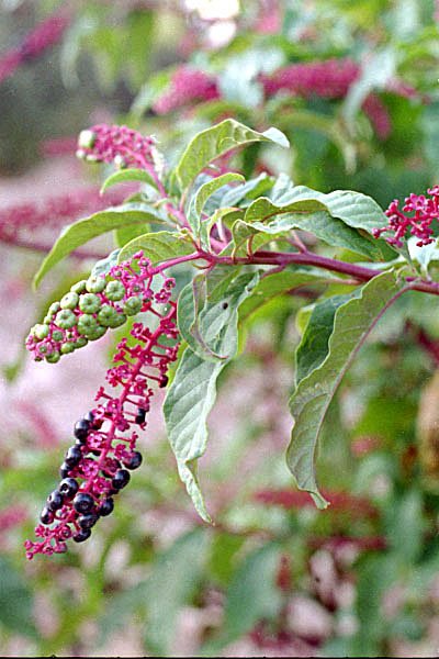 Κοινό δίπλα σε δρόμους, στα χωράφια, σε εγκαταλελειμμένους κήπους, κ.α.. Ένας πολυετής θάμνος, εύρωστος, με κόκκινους συνήθως βλαστούς. Φύλλα μεγάλα, ωοειδή προς λογχοειδή. Άνθη λευκοπράσινα, 5-6 χιλ, σε όρθιους βότρεις. Ιουλ-Οκτ. Καρποί ράγες, 9-10 χιλ. μοβ προς το μαύρο όταν ωριμάσουν.