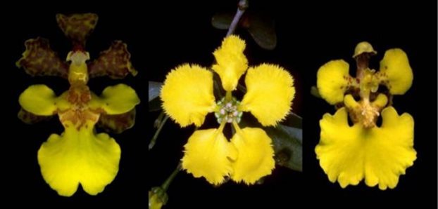 Η αισθητή ομοιότητα για το ανθρώπινο μάτι γίνεται «καρμπόν» στο υπεριώδες φως που βλέπουν οι μέλισσες: αριστερά και δεξιά αντίστοιχα οι ορχιδέες Trichocentrum ascendens και Rossioglossum ampliatum και στο κέντρο το μαλπιγιοειδές Stigmaphyllon (Πηγή A. Papadopulos et al., Proc. R. Soc. B, 280 (2013)